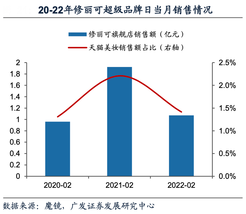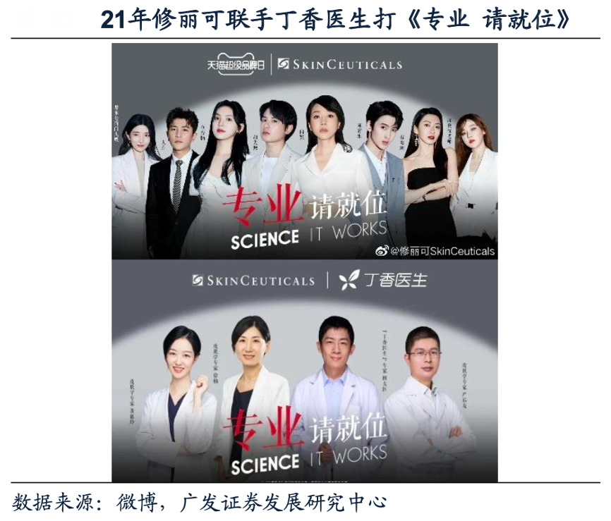 經(jīng)典案例:根據(jù)微博、廣發(fā)證券發(fā)展研究中心等綜合資訊表明,2021年1月至2月期間修麗可聯(lián)合丁香醫(yī)生,在天貓直播間共同打造超級品牌日特約企劃《專業(yè)請就位》,邀請閆妮、胡先煦、章若楠等明星以及知名美妝博主作為品牌摯友,攜手皮膚學(xué)專家為品牌背書,多圈層聯(lián)動(dòng)深度合作,直播內(nèi)容以科普科學(xué)護(hù)膚干貨、運(yùn)用專業(yè)知識(shí)為消費(fèi)者護(hù)膚痛點(diǎn)提出解決方案、對修麗可產(chǎn)品的專業(yè)種草等為主,最終實(shí)現(xiàn)了5.8億微博話題閱讀量以及12萬次直播、轉(zhuǎn)播播放量(包含修麗可天貓直播間、丁香醫(yī)生/丁香媽媽抖音、丁香媽媽APP),2月修麗可旗艦店達(dá)到1.92億元的銷售轉(zhuǎn)化,當(dāng)月天貓美妝市占率高達(dá)2.2%。