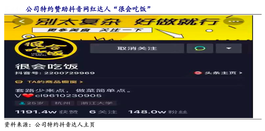 經典案例:根據公司特約抖音達人主頁、開源證券研究所等綜合資訊表明,2019 年,億田智能公司經過用戶群體考察和市場調研,特約贊助的抖音網紅達人“很會吃飯”,助其在 4 個月內漲粉 150 萬,短視頻總播放量過億,視頻中的廣告植入也使得公司品牌收獲大量忠實粉絲。2020 年 11 月,其又聯合小紅書百萬博主“團子 E 菲”、“楊柳依的美食廚房“等進行宣傳,進一步擴大知名度。