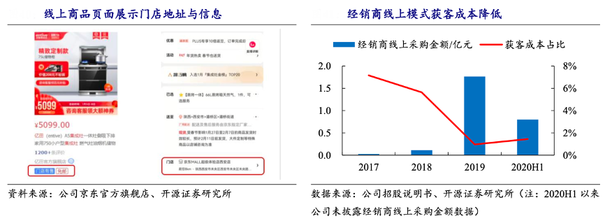 經典案例:根據公司京東官方旗艦店、公司招股說明書、開源證券研究所等綜合資訊表明,為解決實體門店客流量少、獲客成本高的問題,億田智能公司于 2018 年加入京東“門店幫”、天貓“火鳳凰”等新零售渠道,使得公司線上旗艦店的專款商品頁面可以展示門店地址與信息,消費者可快速查找到附近的實體店,進行現場體驗,達到線上線下相互引流的效果。經銷商線上模式的獲客成本由2018年5.64%降為2020年上半年1.44%。
