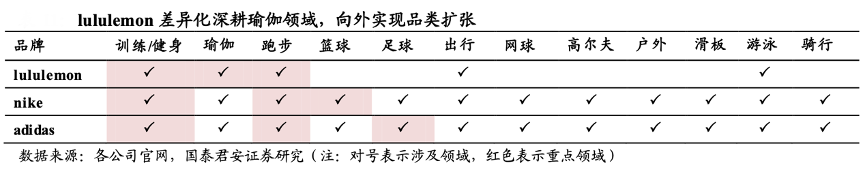 經(jīng)典案例:根據(jù)各公司官網(wǎng)、國(guó)泰君安證券研究等綜合資訊表明,在瑜伽運(yùn)動(dòng)市場(chǎng)尚為藍(lán)海之時(shí),lululemon 差異化定位于瑜伽運(yùn)動(dòng),與其余運(yùn)動(dòng)品牌形成錯(cuò)位競(jìng)爭(zhēng),成功在大牌云集的運(yùn)動(dòng)行業(yè)立足,并樹(shù)立起品牌標(biāo)簽。此后lululemon 也逐步向跑步、網(wǎng)球、健身等領(lǐng)域拓展,盡管其他運(yùn)動(dòng)品牌也紛紛布局以瑜伽為代表的女子運(yùn)動(dòng)領(lǐng)域,但 lululemon 憑借先發(fā)優(yōu)勢(shì)在瑜伽領(lǐng)域一枝獨(dú)秀。