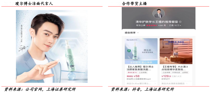 經(jīng)典案例:根據(jù)公司官網(wǎng)、抖音、上海證券研究所等綜合資訊表明,璦爾博士品牌聚焦傳播微生態(tài)護膚理念,聯(lián)合聚美麗舉辦“皮膚微生態(tài)大會”,塑造品牌專業(yè)的形象,提升用戶信賴感和好感度。2021年 9 月璦爾博士正式官宣演員許凱作為其潔面代言人,通過明星的流量轉(zhuǎn)化為品牌的持續(xù)曝光,利用粉絲經(jīng)濟增加產(chǎn)品的轉(zhuǎn)化率。同時,璦爾博士與清華護膚學長王植等成分黨美妝類主播進行合作;2021年上半年開始采用 CPS 推廣等多種新型營銷推廣模式,實現(xiàn)產(chǎn)品銷售快速增長。