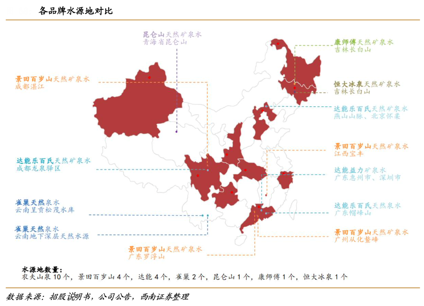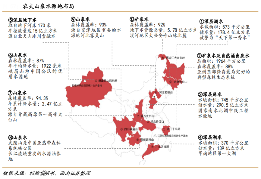 經(jīng)典案例:根據(jù)招股說明書、公司公告、西南證券等綜合資訊表明,農(nóng)夫山泉水源地遍布全國,分散化的水源基地有助于縮短運輸半徑,更高效地就近服務零售市場。從全國范圍來看,農(nóng)夫山泉在其他品牌水源地的所在省份均有布局,在質(zhì)量及數(shù)量上更勝一籌,在產(chǎn)能方面具有壟斷性優(yōu)勢。