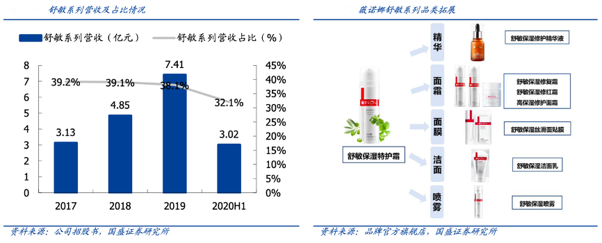經(jīng)典案例:根據(jù)公司招股書、品牌官方旗艦店、國盛證券研究所等綜合資訊表明,薇諾娜舒敏系列產(chǎn)品除面霜品類外延伸至精華、噴霧等品類,此外,面霜品類內(nèi)也基于特護(hù)霜衍生出使用場景更為細(xì)分的產(chǎn)品,如針對(duì)非敏感型泛紅肌膚推出“修紅霜”,針對(duì)干性敏感肌推出高保濕版本修護(hù)霜等。舒敏全系列產(chǎn)品 2017-2020H1 銷售收入分別為 3.13/4.85/7.41/3.02 億元;占比總營收分別為 39.23%/39.09%/38.11%/32.06%,樹立了針對(duì)敏感肌產(chǎn)品的行業(yè)標(biāo)桿,“薇諾娜”品牌于 2019 年被行業(yè)權(quán)威雜志《化妝品報(bào)》評(píng)為“敏 感肌護(hù)理品類第 1 名”。