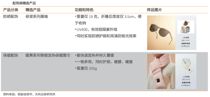 經(jīng)典案例:根據(jù)招股說(shuō)明書、天風(fēng)證券研究所等綜合資訊表明,蕉下配飾包括保暖系列圍巾、手套和口罩等,溫暖舒適。例如,智能保暖圍巾配備石墨烯加熱墊,通電幾分鐘內(nèi)即迅速升到舒適溫度,還包括多功能肩包、手提包及手提袋,方便戶外攜帶收納。