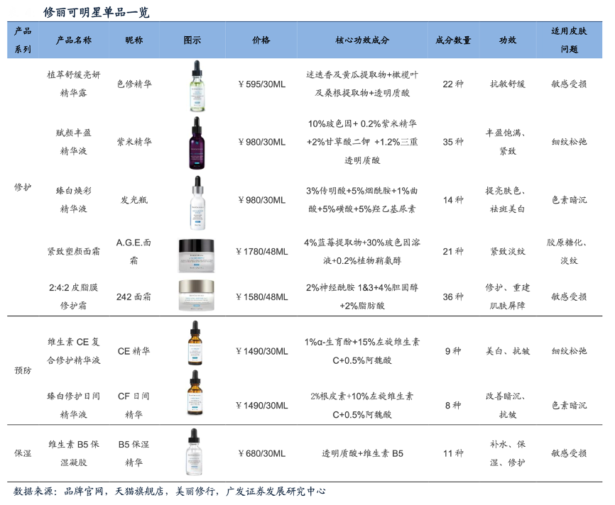 經(jīng)典案例:根據(jù)品牌官網(wǎng)、天貓旗艦店、美麗修行、廣發(fā)證券發(fā)展研究中心等綜合資訊表明,修麗可成功打造的明星單品包括主打修護的色修精華、發(fā)光瓶精華、紫米精華、A.G.E.面霜、242面霜,主打預防的CE精華、CF日間精華,以及主打保濕的B5精華。