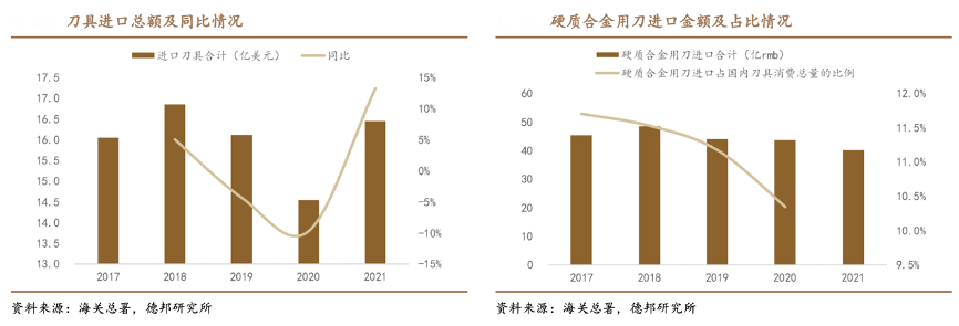 經(jīng)典案例:根據(jù)海關(guān)總署、德邦研究所等綜合資訊表明,2020年國內(nèi)百億硬質(zhì)合金數(shù)控刀片市場中,進口數(shù)控刀片的規(guī)模約在 44 億元,結(jié)合據(jù)產(chǎn)業(yè)跟蹤國際品牌在國內(nèi)設(shè)廠也有 20 多億的份額,國產(chǎn)品牌的份額在 30 億左右,國產(chǎn)化率在 30%左右,存在較大提升空間。從海關(guān)總署的進口數(shù)據(jù)來 看,2017 年以來我國刀具進口總量基本維持在 16 億美元左右的規(guī)模,其中硬質(zhì) 合金進口額占國內(nèi)刀具需求的比重呈現(xiàn)出逐年下滑的趨勢。