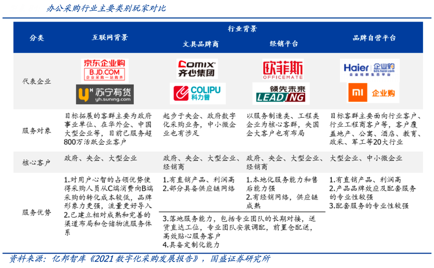 經(jīng)典案例:根據(jù)億邦智庫《2021數(shù)字化采購發(fā)展報告》、國盛證券研究所等綜合資訊表明,辦公采購行業(yè)呈現(xiàn)兩大趨勢:1)采購平臺加速數(shù)字化轉(zhuǎn)型,向“硬件+軟件+服務(wù)”融合發(fā)展模式變革,京東、齊心集團、科力普等處于龍頭地位,專業(yè)技術(shù)平臺如 Coupa 等加入競爭;2)品類、客群形成交叉,辦公采購電商拓展 MRO 品類,MRO垂直平臺布局辦公市場,市場競爭加劇。