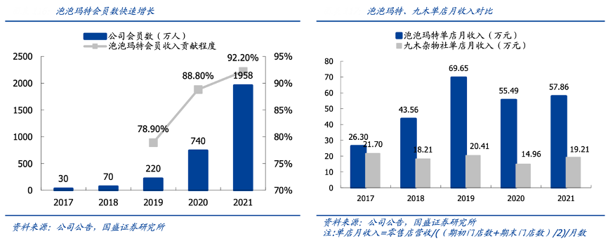 經(jīng)典案例:根據(jù)公司公告、國盛證券研究所等綜合資訊表明,2019- 2021 泡泡瑪特會員數(shù)從 220 萬提升至 1958 萬,收入貢獻度從 78.9%提升至 92.2%; 而截至 2021 年,九木雜物社會員人數(shù)超 300 萬。