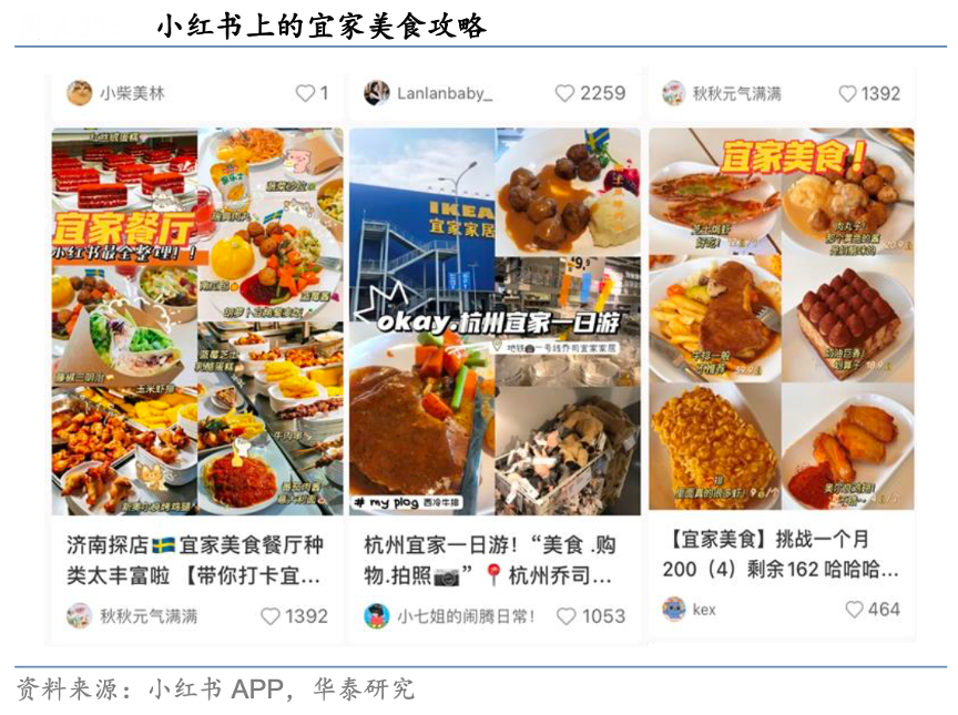 經(jīng)典案例:根據(jù)小紅書APP、華泰研究等綜合資訊表明,宜家創(chuàng)造性地在門店中引入餐飲這類高流量場景,早在第一家宜家商場在瑞士成立時,考慮到顧客逛完大店后的疲憊感,宜家就專門開出小茶座,為 顧客提供甜點及飲料,這一經(jīng)營策略一直得以延續(xù)。時至今日,宜家美食已經(jīng)成為宜家商 場獨特的標(biāo)簽,瑞典肉丸等爆品頻頻出圈,今日家居調(diào)查顯示宜家 30%的顧客進(jìn)店是為了 品嘗美食,“1 元冰淇淋”則是宜家最暢銷的單品,平均年銷量超過 1200 萬只。