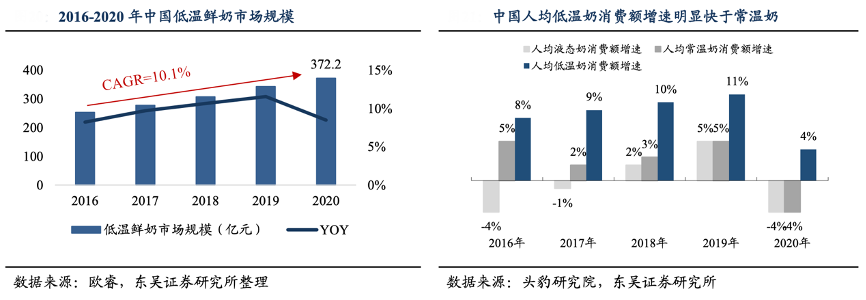 經典案例:根據歐睿、頭豹研究院、東吳證券研究所等綜合資訊表明,低溫鮮奶采用巴氏殺菌技術實現殺滅有害菌群并保存活性營養(yǎng)物質,消費者對健康的更高追求及冷鏈的快速發(fā)展助力低溫鮮奶的發(fā)展。2016-2020年,中國低溫奶業(yè)務以 10.1%的年復合增長率迅速增長,至 2020 年市場規(guī)模已超 370 億元。中國低溫奶消費正處于量價齊升階段,人均低溫奶消費量和單價均持續(xù) 增長,且增速明顯快于常溫奶和液態(tài)奶整體。