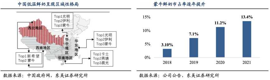 經典案例:根據中國政府網、公司公告、東吳證券研究所等綜合資訊表明,受低溫奶保質期短的影響,低溫鮮奶市場以奶源為中心,冷鏈運輸為半徑,地方性乳企擁有先天優(yōu)勢,競爭格局區(qū)域特征鮮明。而近年來,蒙牛、伊利等全國性乳企利用渠道、品牌優(yōu)勢及全國化奶源布局爭相布局低溫鮮奶市場。2018-2021年,蒙牛在鮮奶市場的市占率持續(xù)提升,2021年已達13.4%,躍升至行業(yè)第二,第一位為深耕華東市場的光明乳業(yè)。