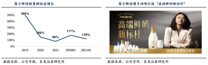 經(jīng)典案例:根據(jù)公司年報、公司官網(wǎng)、東吳證券研究所等綜合資訊表明,每日鮮語憑借高標(biāo)準(zhǔn)牧場、高標(biāo)準(zhǔn)奶源、高標(biāo)準(zhǔn)管理,成為高端鮮奶代表品牌。2019-2021,每日鮮語持續(xù)升級產(chǎn)品,相繼推出 A2 鮮牛奶、有機(jī)鮮牛奶、迷你解 饞奶茶等。2020 年,每日鮮語簽約湯唯為代言人,深化品牌影響力,定位精致人群;并 與奈雪的茶、迪士尼等合作進(jìn)行 IP 營銷吸引年輕消費(fèi)群體,深化“高端鮮奶行業(yè)新標(biāo)桿”形象。