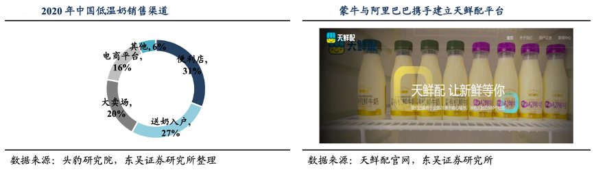 經(jīng)典案例:根據(jù)頭豹研究院、天仙配官網(wǎng)、東吳證券研究所等綜合資訊表明,受制于保質(zhì)期短和需低溫保存的特點(diǎn),2020年低溫奶在便利店/送奶入戶/大賣場/電商平臺的渠道占比分別為 31%/27%/20%/16%,送奶入戶成為其特色渠道。2021年度,蒙牛鮮奶在京東、山姆會員店、永輝等渠道實(shí)現(xiàn)鮮奶銷售額第一名;O2O到家業(yè)務(wù)、社區(qū)生鮮平臺已實(shí)現(xiàn)綜合份額第一。