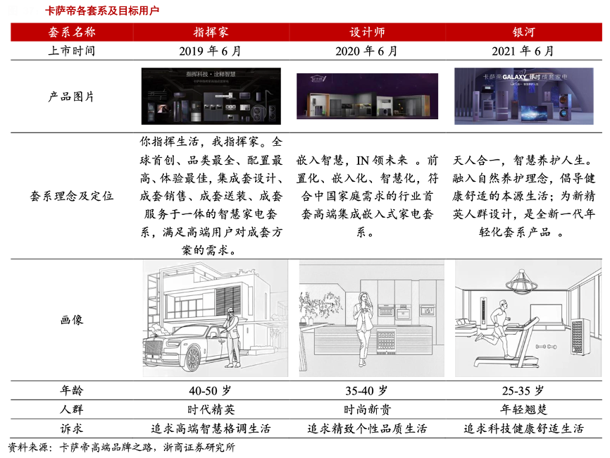 經(jīng)典案例:根據(jù)卡薩帝高端品牌之路、浙商證券研究所等綜合資訊表明,薩帝在 2019 年、2020 年和 2021 年上新了指揮家、設(shè)計(jì)師和銀河套系產(chǎn)品,其用戶畫(huà)像從時(shí)代精英到時(shí)尚新貴,再到年輕翹楚,年齡呈下降趨勢(shì)。這符合80后、90后逐漸成為高端消費(fèi)主力的趨勢(shì)。同時(shí)卡薩帝在三年內(nèi)接連推出成套化產(chǎn)品,用戶年齡橫跨25-50歲,在消費(fèi)人群全覆蓋的基礎(chǔ)上,也進(jìn)一步激發(fā)了年輕化市場(chǎng)的高端需求。