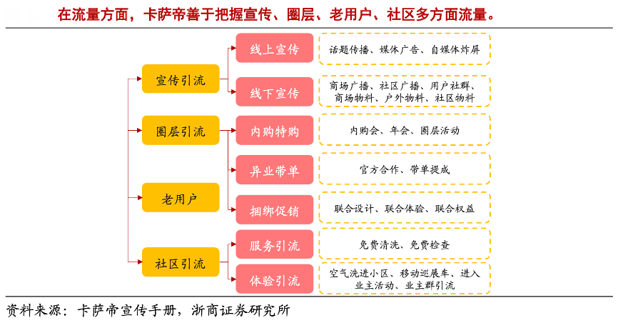 經(jīng)典案例:根據(jù)卡薩帝宣傳手冊(cè)、浙商證券研究所等綜合資訊表明,卡薩帝的營(yíng)銷(xiāo)引流方式分為宣傳引流、圈層引流、老用戶引流和社區(qū)引流四種方式。在宣傳引流上,卡薩帝積極擁抱線上自媒體,通過(guò)抖音短視頻、微信話題進(jìn)行營(yíng)銷(xiāo), 在線下渠道除了傳統(tǒng)的物料宣傳,卡薩帝聯(lián)合居委會(huì)通過(guò)社區(qū)傳播。而在在圈層引流上,卡薩帝專注私域流量建設(shè),針對(duì)不同的圈層采取聯(lián)合設(shè)計(jì)、官方合作等方式有針 對(duì)性地進(jìn)行營(yíng)銷(xiāo)。同時(shí)卡薩帝進(jìn)入社區(qū)年會(huì),舉 辦業(yè)主答謝會(huì),并為社區(qū)消費(fèi)者講解加點(diǎn)難題,宣傳卡薩帝促銷(xiāo)節(jié)點(diǎn)的購(gòu)機(jī)權(quán)益。
