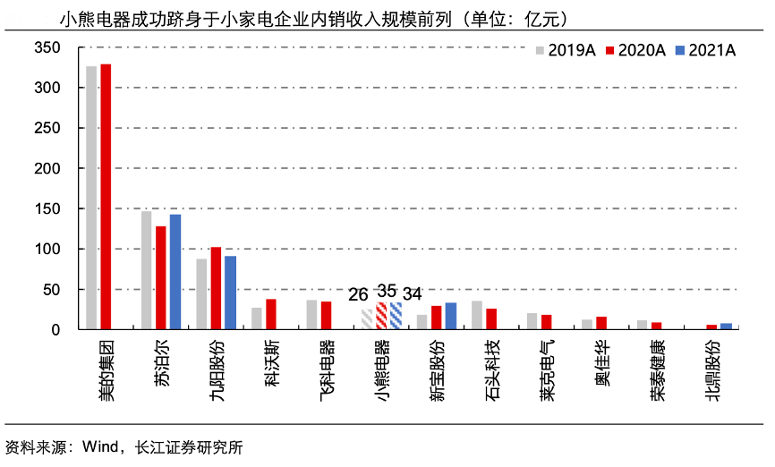 經(jīng)典案例:根據(jù)wind、長(zhǎng)江證券研究所等綜合資訊表明,小熊電器在美的、蘇泊爾、九陽已經(jīng)搶占了國內(nèi)廚房小家電的核心大品類賽道、線下渠道壁壘深厚的背景下,依靠對(duì)創(chuàng)意個(gè)性化細(xì)分需求的挖掘,深耕于電商渠道,成功獲得了規(guī)??焖僭鲩L(zhǎng)。2021年,小熊電器公司內(nèi)銷收入達(dá)到 34 億元,接近蘇泊爾 內(nèi)銷收入 1/4,九陽內(nèi)銷收入的 1/3,內(nèi)銷規(guī)模在廚房小家電行業(yè)中排序第四。