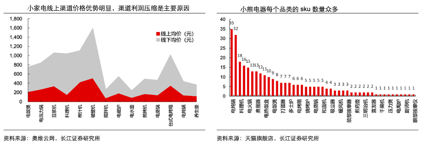 經(jīng)典案例:根據(jù)奧維云網(wǎng)、天貓旗艦店、長(zhǎng)江證券研究所等綜合資訊表明,2013 年之后快速崛起的電商渠道,十分契合個(gè)性化小家電的發(fā)展需求。線上渠道極大豐富了商品展示,多樣的新興品類、大批量的 SKU 得以全方面展示。因此,電商渠道崛起之時(shí),小熊憑借本身已儲(chǔ)備較為豐富的個(gè)性化創(chuàng)意小家電品類,乘線上渠道紅利,取得了亮眼的成長(zhǎng)表現(xiàn)。