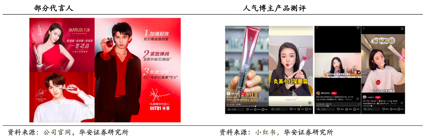 經(jīng)典案例:根據(jù)公司官網(wǎng)、小紅書、華安證券研究所等綜合資訊表明,丸美公司在2020 年簽約朱正廷成為品牌大使,簽約《創(chuàng)造營 2021》成團(tuán)“INTO1”的林墨為精華代言人,米卡為眼部護(hù)理代言人,丸美官微實(shí)現(xiàn) 128%的粉絲增長。同時(shí)其邀請(qǐng)“頭部”博主參與產(chǎn)品測評(píng),對(duì)產(chǎn)品進(jìn)行功能推廣。小紅蝎精華上市前,丸美便邀請(qǐng)國貨護(hù)膚先鋒@精致大姨夫、樂活美膚專家@小茂、人氣美妝博主@崔佳楠等親臨 溯源丸美研發(fā)中心,并現(xiàn)場親測其抗老功效。依靠明星聲量以及高質(zhì)量KOL,觸達(dá)更多受眾深度種草,丸美實(shí)現(xiàn)聲量和電商引流的直線增長。