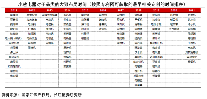 經(jīng)典案例:根據(jù)國(guó)家知識(shí)產(chǎn)權(quán)局、長(zhǎng)江證券研究所等綜合資訊表明,從品類最早涉及的相關(guān)專利時(shí)間來(lái)看,小熊電器公司大部分品類的研發(fā)時(shí)間較早,提前針對(duì)性地做好產(chǎn)品儲(chǔ)備;如 2011 年涉及到的加熱杯 墊在近年來(lái)消費(fèi)熱點(diǎn)逐步出現(xiàn),如 2012 年涉及到的加熱飯盒在 2020 年受益于疫情快 速爆發(fā),如 2019 年公司研發(fā)了按摩儀的對(duì)應(yīng)產(chǎn)品,而 2020 年以來(lái)按摩儀系列產(chǎn)品的行業(yè)消費(fèi)景氣度持續(xù)較優(yōu)??梢姽緦?duì)于小家電的產(chǎn)品品類覆蓋面較廣,且大部分品類的相關(guān)儲(chǔ)備做得較早,走在市場(chǎng)需求之前。