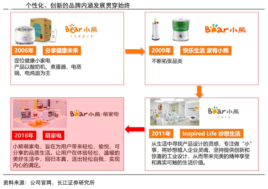經(jīng)典案例:根據(jù)公司官網(wǎng)、長(zhǎng)江證券研究所等綜合資訊表明,早在 2006 年,小熊公司在廣州佛山成立的初始 階段,其已開發(fā)了酸奶機(jī)、煮蛋器、電蒸鍋、電燉盅等當(dāng)前仍在熱銷的小家電細(xì)分品類。此后,公司品牌內(nèi)涵不斷迭代和演化,“健康未來(lái)”—“快樂生活”—“妙想生活” —“萌家電”,無(wú)一不是從區(qū)別于美九蘇的差異化定位出發(fā)。