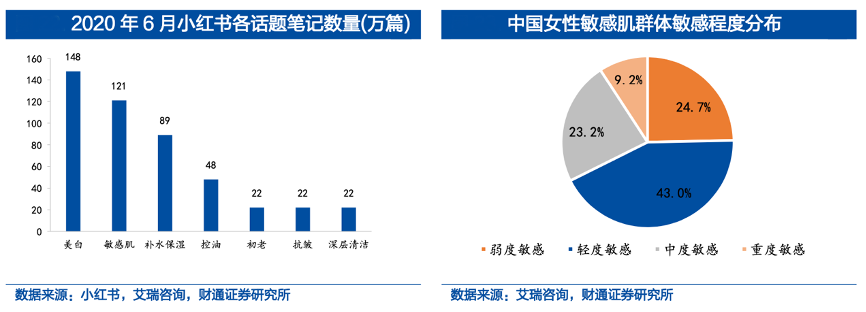 經(jīng)典案例:根據(jù)小紅書、艾瑞咨詢、財(cái)通證券研究所等綜合資訊表明,長(zhǎng)期佩戴口罩會(huì)造成皮膚封閉,容易導(dǎo)致敏感、閉口、長(zhǎng)痘。超過七成的敏感肌問題可以通過日常的保養(yǎng)護(hù)膚得到改善。消費(fèi)者對(duì)敏感肌專業(yè)護(hù)理的認(rèn)知和關(guān)注度不斷提升,根據(jù)艾瑞咨詢報(bào)告,截至 2020 年 6 月小紅書平臺(tái)“敏感肌”話題筆記高達(dá) 121 萬篇,遠(yuǎn)高于“補(bǔ)水保 濕”、“控油”等傳統(tǒng)護(hù)膚熱點(diǎn)話題筆記數(shù)量。