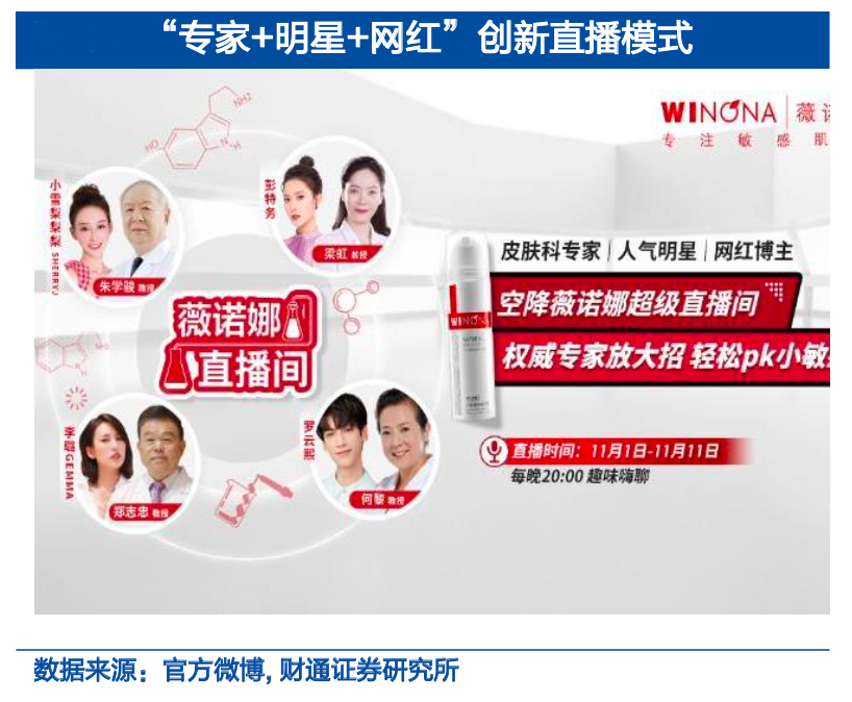 經(jīng)典案例:根據(jù)官方微博、財(cái)通證券研究所等綜合資訊表明,薇諾娜公司從 2013 年起,薇諾娜邀請(qǐng)皮膚科專家在官微及其他平臺(tái)進(jìn)行免費(fèi)直播義診,累計(jì)達(dá)數(shù)百場(chǎng);2020 年更成為首個(gè)受邀參加天貓超級(jí)品牌日的護(hù)膚國貨品牌,通過“專家科普+明星推薦+網(wǎng)紅博主”的創(chuàng)新直播模式進(jìn)行產(chǎn)品深度種草,活動(dòng)期間取得了很好的品牌宣傳和市場(chǎng)聲量。2021 年,深度合作超頭 KOL 李佳琦進(jìn)行營銷創(chuàng)新,參與《所有女生的 offer》 綜藝節(jié)目,更成功打造出爆品單品凍干面膜。