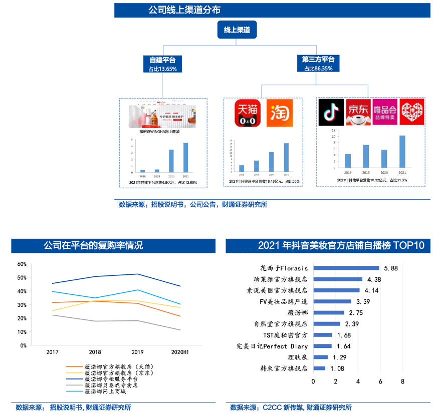 經(jīng)典案例:根據(jù)招股說(shuō)明書(shū)、公司公告、C2CC新傳媒、財(cái)通證券研究所等綜合資訊表明,薇諾娜公司線上分為自營(yíng)渠道和分銷渠道,主要通過(guò)第三方平臺(tái)和自建平臺(tái)進(jìn)行銷售。其在阿里系2021年實(shí)現(xiàn)營(yíng)收 18.18 億元,占線上渠道比重55%。同時(shí)其還創(chuàng)建了公眾號(hào)“薇諾娜專柜服務(wù)平臺(tái)”等私域平臺(tái),通過(guò)私域流量運(yùn)營(yíng)進(jìn)一步增強(qiáng)客戶粘性、提高復(fù)購(gòu)率。2017- 2020H1,薇諾娜專柜服務(wù)平臺(tái)的客戶復(fù)購(gòu)率保持在 50%左右的較高水平,顯著高于天貓、京東等公域流量平臺(tái)。