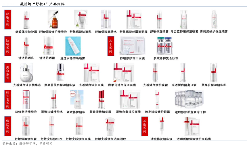 經(jīng)典案例:根據(jù)薇諾娜官網(wǎng)、華泰研究等綜合資訊表明,薇諾娜從舒敏到“舒敏+”,積極拓展“抗初老”、“美白”、“修紅”等多功效品類(lèi),打造多矩陣“產(chǎn)品家族”。2021年 4 月推出“抗初老”的雙修賦活精華液(398 元/30ml),21 年雙 11 推出“美白”系列的光皙透白淡斑精華液(398 元/30ml),成為支撐美白系列和精華產(chǎn)品線增長(zhǎng)的重要驅(qū)動(dòng),22Q1 光透皙白系列銷(xiāo)售收入接近 3000 萬(wàn)。
