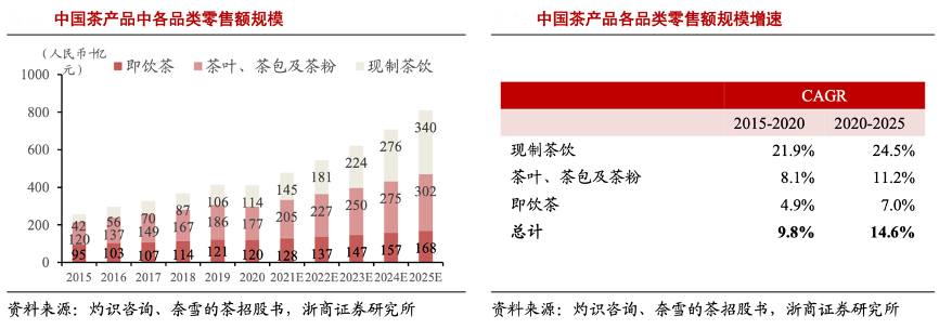 經(jīng)典案例:根據(jù)灼識(shí)咨詢、奈雪的茶招股書、浙商證券研究所等綜合資訊表明,2015-2020 年,現(xiàn)制茶飲的零售額規(guī)模從 422 億元增長(zhǎng) 至 1135 億元,CAGR 約為 21.9%;且伴隨消費(fèi)需 求升級(jí)和外賣便捷程度提高,2015-2020 年現(xiàn)制茶飲占整體茶市場(chǎng)比例從 16.43%上升至 27.64%,且占比仍在持續(xù)提升。