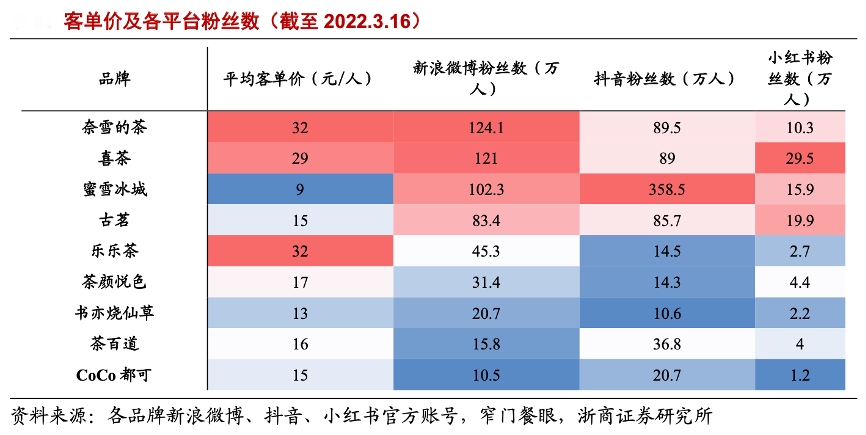 經(jīng)典案例:根據(jù)各品牌新浪微博、抖音、小紅書官方帳號(hào)、窄門餐眼、浙商證券研究所等綜合資訊表明,結(jié)合前瞻產(chǎn)業(yè)研究院和奈雪的茶招股書數(shù)據(jù),2020 年中國(guó)高端現(xiàn)制茶飲零售額市占率前五大玩家分別為喜茶、奈雪的茶、KOI、樂樂茶和伏見桃山,CR2 為 46.6%,CR5 為 58.3%,高端市場(chǎng)集中度較高,且前兩大龍頭喜茶、奈雪的茶市占率遠(yuǎn)高于其他品牌。根據(jù)各品牌在主流社交媒體粉絲數(shù)量統(tǒng)計(jì),截至2022年3月16日,奈雪的茶、喜茶分別在微博、小紅書平臺(tái)擁有最高的粉絲數(shù)量,心智占領(lǐng)程度較高。