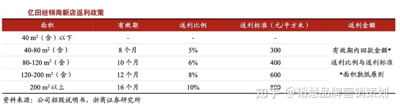 經(jīng)典案例:根據(jù)公司招股說(shuō)明書、浙商證券研究所等綜合資訊表明,具體來(lái)看新店返利政策,億田更鼓勵(lì)開大店。根據(jù)公司招股書,40 平及以下新店無(wú) 返利資格,40-80 平(含)、80-120 平(含)、120 平至 200 平(含)、200 平以上的返 利比例分別為 5%、6%、8%、10%,返利標(biāo)準(zhǔn)分別為 300 元/平、400 元/平、600 元/平、800 元/平,大店的返利越高。