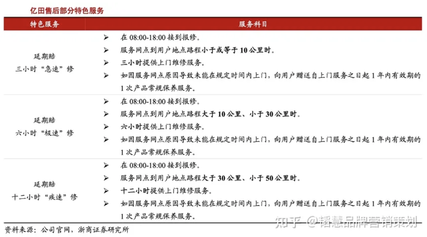 經(jīng)典案例:根據(jù)公司官網(wǎng)、浙商證券研究所等綜合資訊表明,億田服務(wù)小哥設(shè)立 365 天全年無(wú)休快速應(yīng)答的服務(wù)時(shí)效機(jī)制,截至 21H1,其服務(wù)網(wǎng)絡(luò)已覆蓋全國(guó)所有銷售區(qū)域。億田服務(wù)小哥落實(shí) 10 公里內(nèi)三小時(shí)“急速”修、10 至 30 公里內(nèi) 六小時(shí)“極速”修及 30 至 50 公里內(nèi)十二小時(shí)“疾速”修。