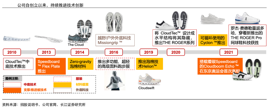 經(jīng)典案例:根據(jù)招股說明書、公司官網(wǎng)、長江證券研究所等綜合資訊表明,On Running(On/昂跑)致力于改善跑步體驗(yàn),CloudTec 中底技術(shù)+Speedboard+HelionTM Superfoam 泡棉材料構(gòu)成公司產(chǎn)品核心特色。