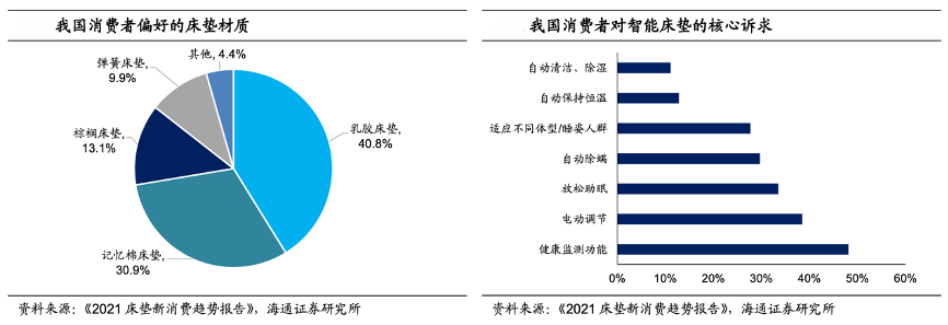 經(jīng)典案例:根據(jù)《2021 床墊新消費趨勢報告》、海通證券研究所等綜合資訊表明,隨著人們對生活質量要求的提高,睡感偏硬、易變型的彈簧床墊逐漸失去吸引力,根據(jù)《2021床墊新消費趨勢報告》,分別有 40.8%、30.9% 的消費者偏愛乳膠、記憶棉材質的床墊。另外,有 48.1%的受訪者希望智能床墊具有睡 眠時健康檢測功能。