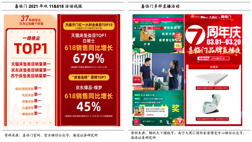 經(jīng)典案例:根據(jù)喜臨門官網(wǎng)、官方微信公眾號、暢玩天下搜狐號、南寧大商匯國際家居博覽中心微信公眾號、、海通證券研究所等綜合資訊表明,喜臨門自 2020 年 3 月以來高頻探索直播渠道,從千人導購抖音種草直播、區(qū)域團購會直播、聯(lián)合頭部主播到總裁直播,流量裂變已顯成效,2020 年 11 月總裁楊剛先生進行直播,吸引 35 萬多人參與互動。