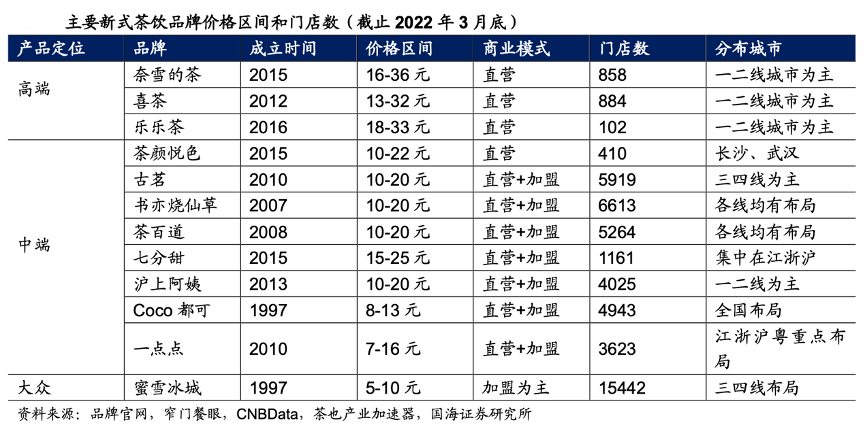 經(jīng)典案例:根據(jù)品牌官網(wǎng)、窄門餐眼、CBNData、茶也產(chǎn)業(yè)加速器、國(guó)海證券 研究所等綜合資訊表明,主要新式茶飲品牌分化突出,一二線城市以高端品牌為主,低線城市更多是中端及大眾品牌。