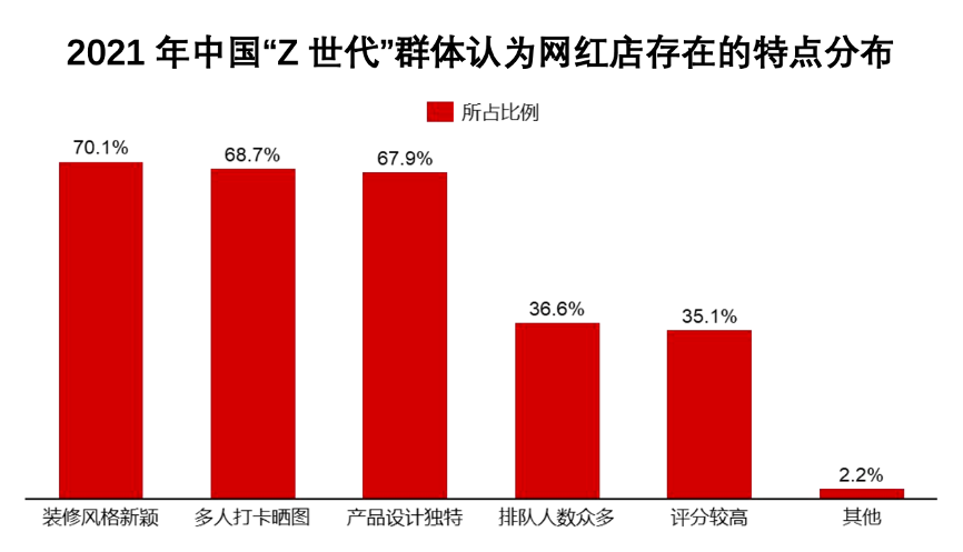 經(jīng)典案例:根據(jù)CCFA《餐飲行業(yè):2021年中國(guó)連鎖餐飲行業(yè)報(bào)告》等綜合資訊表明,新一批茶飲、網(wǎng)紅餐廳滿足了 Z 世代消費(fèi)者的顏值需求,實(shí)現(xiàn)了產(chǎn)品和品牌的迅速的打爆和擴(kuò)張。根據(jù)相關(guān)調(diào)研,Z世代群體認(rèn)為自己愿意去網(wǎng)紅店消費(fèi),主要的原因是裝修風(fēng)格新穎、能夠多人打卡曬圖和產(chǎn)品設(shè)計(jì)獨(dú)特。說明大量 Z 世代愿意去網(wǎng)紅店 打卡主要還是因?yàn)椴蛷d/菜品的顏值和受到營(yíng)銷種草。