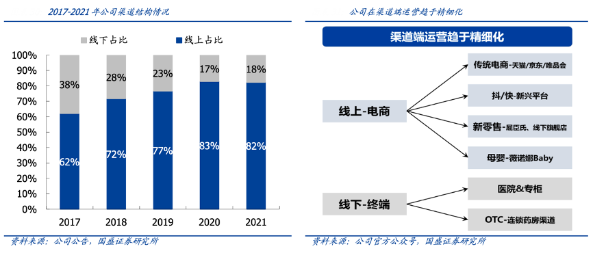 經(jīng)典案例:根據(jù)薇諾娜官方微博、天貓、公司招股書、國盛證券研究所等綜合資訊表明,薇諾娜公司踐行以線下為基礎(chǔ),線上為主導(dǎo)的渠道策略,線下主攻醫(yī)院/OTC 等專業(yè)渠道加深品牌專業(yè)形象,線上渠道充分把握電商及社媒紅利驅(qū)動業(yè)績增長。其在組織端對各業(yè)務(wù)板塊進行相應(yīng)的精細(xì)化升級,將電商事業(yè)部細(xì)分為傳統(tǒng)電商、抖快、新零售、薇諾娜Baby,各板塊劃分職責(zé)范圍;終端事業(yè)部則保留專注于醫(yī)院及院外專柜渠道,獨立出 OTC 事業(yè)部以深耕OTC渠道市場。