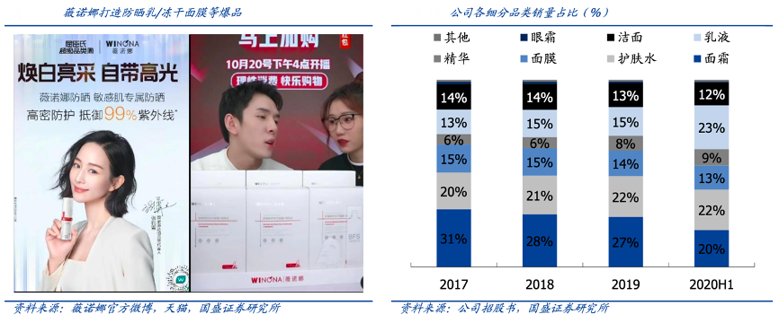 經(jīng)典案例:根據(jù)公司公告、公司官方公眾號、國盛證券研究所等綜合資訊表明,2021年薇諾娜公司上市40余款新品,爆品打造方面,其不斷嘗試多樣化拉新手段,如通過特定品類代言人推廣防曬乳、借助超頭直播流量打造凍干面膜爆品等。雙十一期間,修護凍干面膜全網(wǎng)爆賣200W+盒,防曬乳、舒敏修護精華液銷售金額均破億。