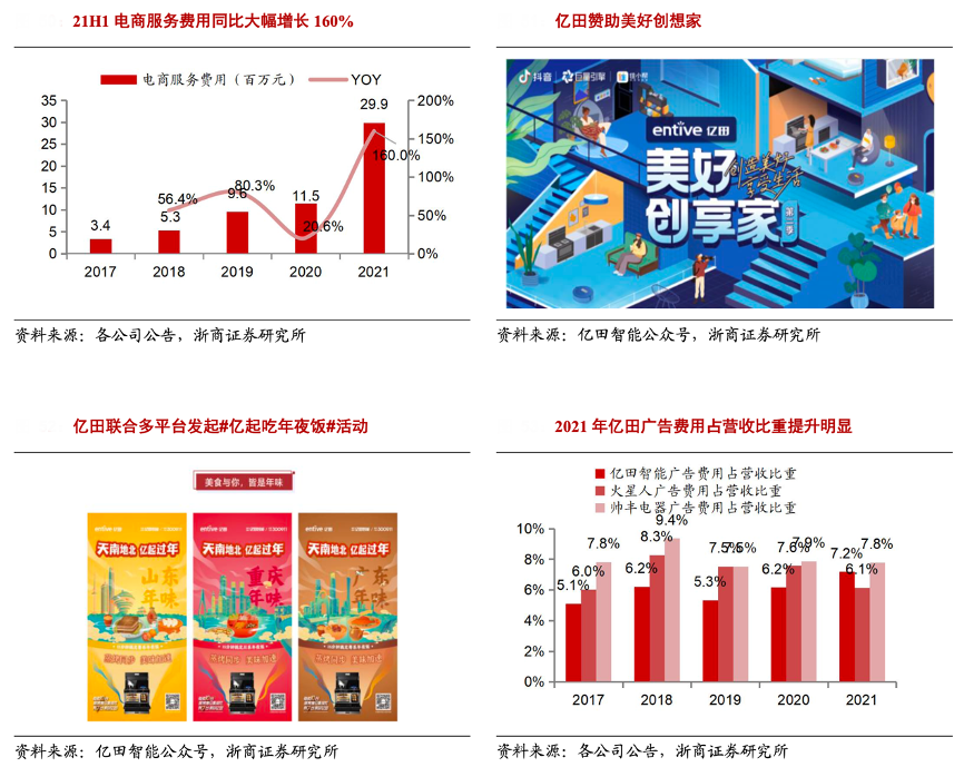 經典案例:根據億田智能公眾號、各公司公告、浙商證券研究所等綜合資訊表明,2021年起億田公司加大電商投入,電商服務費用同比大幅增長 160%。同時,公司側重投放媒介結構的優(yōu)化,互聯網新媒體的投放占比不斷提高,2021 年 9 月億田贊助由央視、抖音、巨量引擎等聯合推出的《美好創(chuàng)享家》節(jié)目;2022 年 1 月億田聯合小紅書、知乎、微博等平臺發(fā)起#億起吃年夜飯#活動,用集成灶烹 飪經典 5 大菜系年夜飯,展現集成灶產品優(yōu)勢。