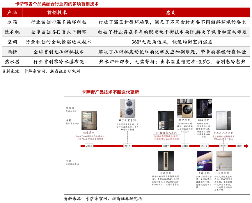經(jīng)典案例:根據(jù)卡薩帝官網(wǎng)、浙商證券研究所等綜合資訊表明,卡薩帝冰箱系列產(chǎn)品朗度、F+、無界嵌入在關(guān)鍵技術(shù)上不斷突破,實現(xiàn)保鮮時長翻倍、散熱邊距從 2cm 到 0cm。洗衣機系列雙子、纖見、融合以用戶需求為落腳點,不斷拓展服務(wù)人群,從母嬰到奢侈品消費群體??照{(diào)系列云鼎、天凈、天悅則注重打造健康環(huán)境,無論在霧霾盛行期間,還是在疫情居家期間,都能提供舒適的室內(nèi)空間。