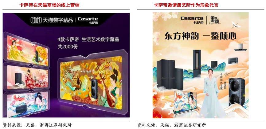 經(jīng)典案例:根據(jù)天貓、浙商證券研究所等綜合資訊表明,2022年三月天貓超級品牌日,卡薩帝搭檔流量明星,聯(lián)合“國家寶藏”IP,傳遞卡薩帝高端“鑒賞家”系列產(chǎn)品的核心概念與獨特賣點,獲得曝光量近 2 億、互動量近 3000 萬。與此同時,卡薩帝首次嘗試打破文化藝術(shù)與數(shù)字科技的界限,特別聯(lián)合天貓數(shù)字藏品,在 3 月 17 日天貓超級品牌日當(dāng)天,限量發(fā)布概念生活藝術(shù)數(shù)字藏品。