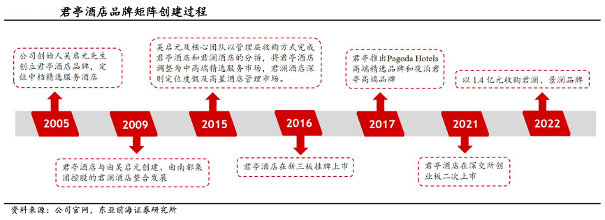 經(jīng)典案例:根據(jù)公司官網(wǎng)、東亞前海證券研究所等綜合資訊表明,2017年,君亭豐富品牌矩陣,推出 Pagoda Hotels 高端精選品牌和夜泊君亭高端品牌,提升品牌調(diào)性。2022 年 1 月 21 日,君亭酒店以 1.4 億收購(gòu)君瀾79%股權(quán)和景瀾70%股權(quán),持續(xù)推進(jìn)高端化布局。