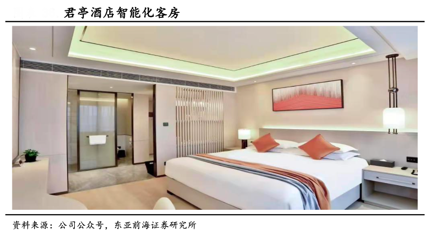 經(jīng)典案例:根據(jù)公司公眾號(hào)、東亞前海證券研究所等綜合資訊表明,君亭酒店充分融合物聯(lián)網(wǎng)技術(shù)對(duì)酒店客房的家電、家具、燈光、公共區(qū)域視頻監(jiān)控等實(shí)現(xiàn)智能控制,目前旗下部分酒店已率先實(shí)現(xiàn)智慧酒店場(chǎng)景建設(shè),例如住宿客人可以根據(jù)喜好智能調(diào)節(jié)客房燈光、溫度、窗簾開(kāi)關(guān)、多媒體設(shè)備操作等,與阿里未來(lái)酒店合作在部分酒店加裝智能電子感應(yīng)門(mén)鎖,注重于客戶的互動(dòng)方式與 個(gè)性化體驗(yàn)的提升。