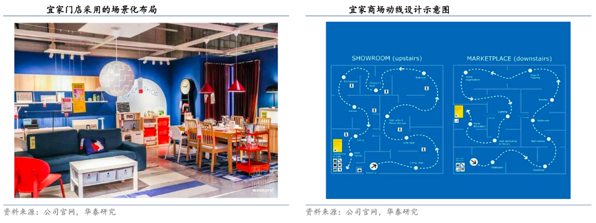 經(jīng)典案例:根據(jù)公司官網(wǎng)、華泰證券等綜合資訊表明,宜家堅持場景化布局,將賣場分割成代表不同功能區(qū)的展示單元(例如廚房、臥室、客廳等),并按照生活場景布置家居用品的擺放,例如臥室家具區(qū)床架、床墊、床品、床頭柜及衣柜等一應(yīng)俱全,營造出真實的居家氛圍,激活消費者的購買欲望。