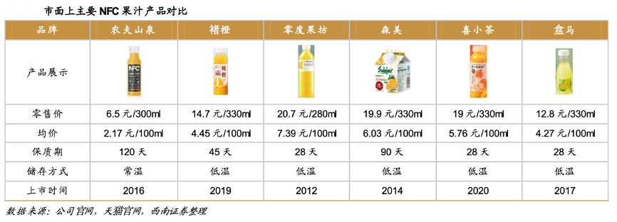 經(jīng)典案例:根據(jù)公司官網(wǎng)、天貓官網(wǎng)、西南證券等綜合資訊表明,農(nóng)夫山泉NFC果汁系列在2008年開始前瞻性布局,經(jīng)歷多年技術(shù)改進(jìn),陸續(xù)解決原料品質(zhì)、臍橙榨汁苦味、無菌罐裝、常溫儲存等一系列技術(shù)難題,于2016年正式推出常溫NFC橙汁產(chǎn)品,可常溫保存 120 天,是目前市面上保存時間最長的 NFC 果汁,形成較高的技術(shù)壁壘。