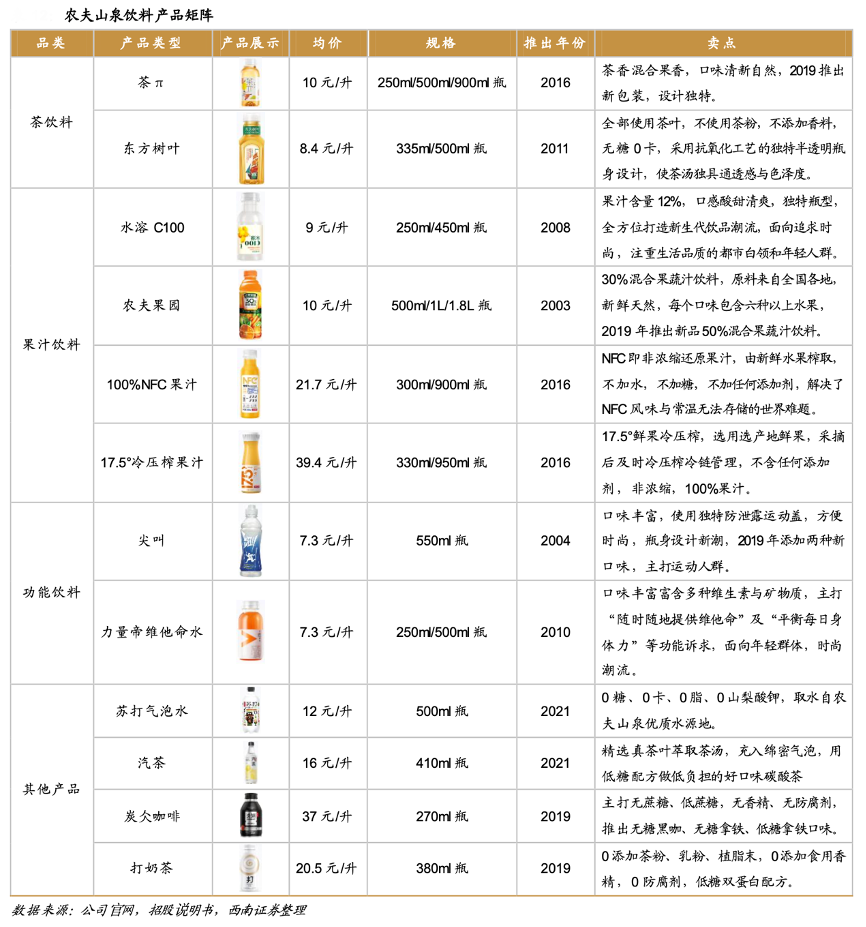 經(jīng)典案例:根據(jù)公司官網(wǎng)、招股說明書、西南證券等綜合資訊表明,農(nóng)夫山泉公司積極拓展“非水類產(chǎn)品”,其“SODA”系列蘇打天然水飲品,一方面選用公司優(yōu)質(zhì)天然水源地的優(yōu)質(zhì)天然水為原料,在蘇打水市場中具有差異化競爭優(yōu)勢,另一方面作為“近水類”飲品,能夠更好享受公司包裝飲用水的渠道協(xié)同效應(yīng)。