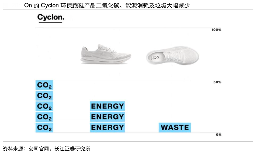 經(jīng)典案例:根據(jù)公司官網(wǎng)、長江證券研究所等綜合資訊表明,On 在其成立一個(gè)月后就獲得了 ISPO(唯一 面向全球運(yùn)動(dòng)行業(yè)產(chǎn)品的權(quán)威評(píng)選)新品牌獎(jiǎng)。同時(shí),On的Cyclon環(huán)保跑鞋產(chǎn)品二氧化碳、能源消耗及垃圾大幅減少。