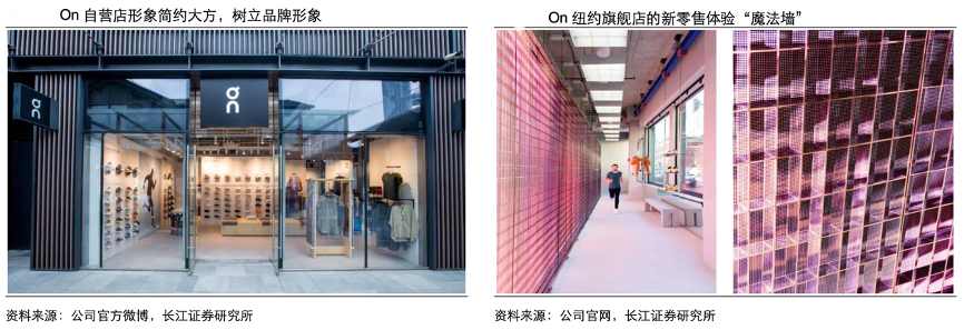 經(jīng)典案例:根據(jù)公司官方微博、公司官網(wǎng)、長江證券研究所等綜合資訊表明,On旗艦店和自營店主要起梳理品牌形象和培育消費(fèi)者品牌認(rèn)知的作用,adw 選址位于核心商圈且店鋪形象簡約,并以新零售體驗(yàn)向消費(fèi)者傳遞品牌的科技概念,如紐約旗艦店的“魔法墻”實(shí)時(shí)掃描購物者的跑步風(fēng)格,以幫助他們找到適合其跑步風(fēng)格和需求的鞋款。