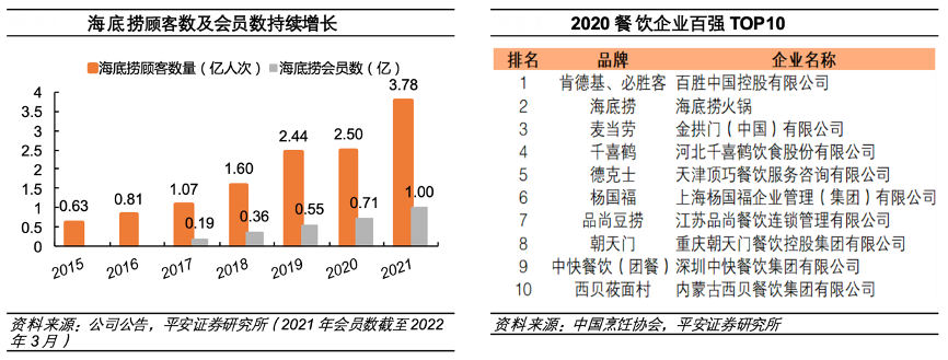 經(jīng)典案例:根據(jù)公司公告、中國(guó)烹飪協(xié)會(huì)、平安證券研究所等綜合資訊表明,海底撈公司依托“連住利益,鎖住管理”的理念及模式全面激發(fā)員工積極性,以優(yōu)質(zhì)的產(chǎn)品和極致的服務(wù)在行業(yè)中獨(dú)樹(shù)一幟,贏得良好的市場(chǎng)口碑。其客流基礎(chǔ)龐大,2021年服務(wù)人次超 3.78 億,截至 2022 年 3 月注冊(cè)會(huì)員數(shù)超 1 億,并榮登 2020 年中國(guó)餐飲百?gòu)?qiáng)榜單第二名。